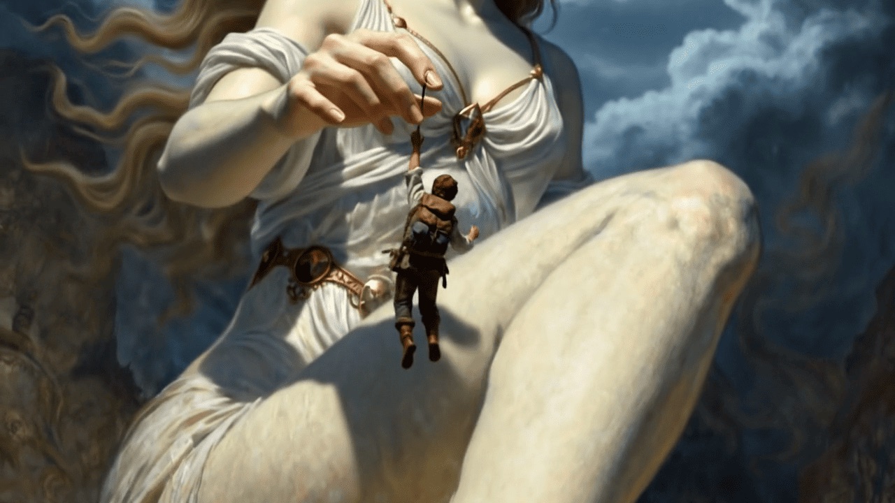 A slow upward camera tilt starting from a colossal female figure's feet, gradually revealing her full Renaissance-painted form reclining against dramatic stormy clouds. She wears delicate white draped gown with golden accessories, pale luminous skin contrasting deep blue-grey atmosphere. A tiny male explorer dangles from her graceful hand, appearing minuscule against her massive scale. Long flowing hair moves softly in wind, clouds shift slowly creating ethereal atmosphere. Dramatic painterly lighting with soft chiaroscuro effects, rich oil painting textures, romantic fantasy composition evoking classical masters.