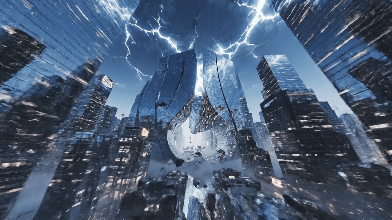 {"shot": "24mm ultra wide, crane dive with tilt spin into mirrored tower tunnel, 1000fps on fold", "subject": "monolithic skyscrapers twisting into fractals, floors reversing, glass rotating, floating debris and melting signage", "scene": "dense futuristic city warped by gravity, blue dusk to neon night, sky fracture with fog drift", "action": "buildings invert, stretch, collapse inward, reform behind camera", "vfx": "glass ripple, gravity warps, space fold trails", "lighting": "low contrast urban glow, interior flicker, reflective pulses", "color": "steel blue, neon chrome, void grey", "audio": "inverted drones, clockwork pulses, brass rumbles, deep echo, warped hum"}