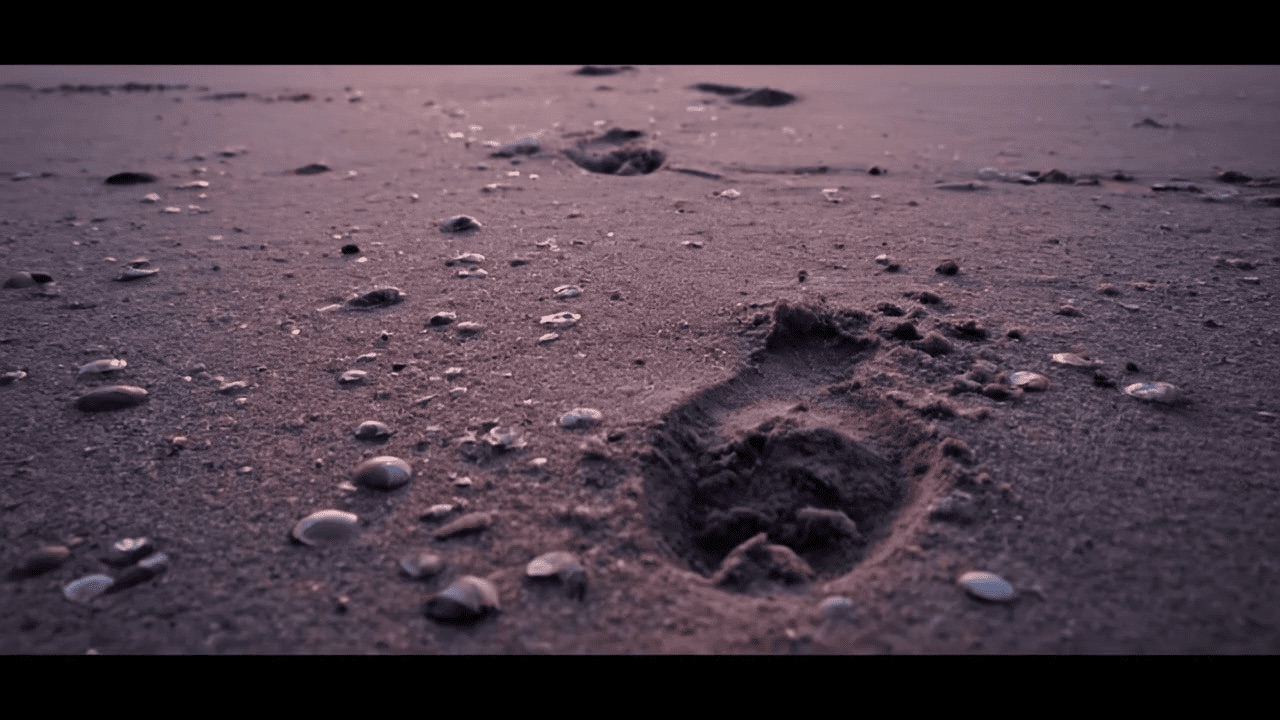 A twilight beach where waves crash with rhythmic force. Camera begins at eye level with sand, capturing tiny details of seashells, water droplets, and footprints left by mysterious figure at water's edge. Slowly lifts into air, swirling 360 degrees to reveal horizon ablaze with setting sun colors and dark ocean stretching beneath the silhouetted figure. Cinematic, dramatic atmosphere.