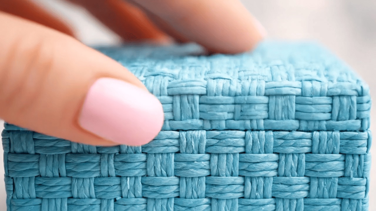 Close-up of hand lifting lid of pastel blue woven box, revealing miniature boutique world inside. Pastel counters, mirrored panels, glowing shelves. Center: pastel blue delivery van stops, tiny staff in couture uniforms open doors, unveiling radiant perfume bottle. Staff carefully lift perfume, carry across boutique floor, place on pedestal in spotlight. Camera tracks movement then pulls away as hand gently closes lid. Magical, nostalgic, warm lighting. Ready to loop seamlessly.