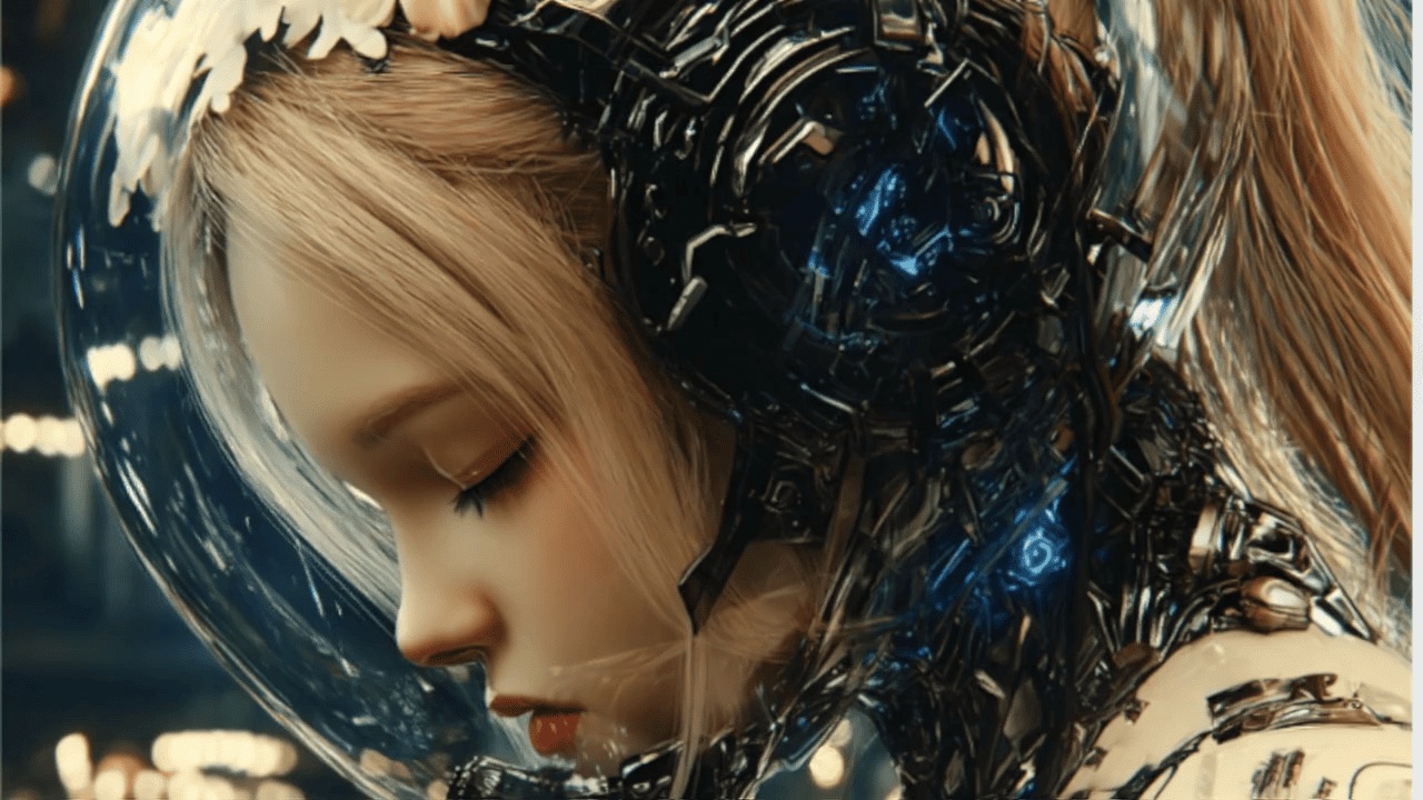 Elf Galadriel dressed in sleek robot outfit in dark setting, wearing earphones. Style: daz3d anime art, cyan and black color scheme, ricoh ff-9d aesthetic, sandalpunk and babycore fusion. High stylization with chaotic artistic elements, 9:16 aspect ratio.