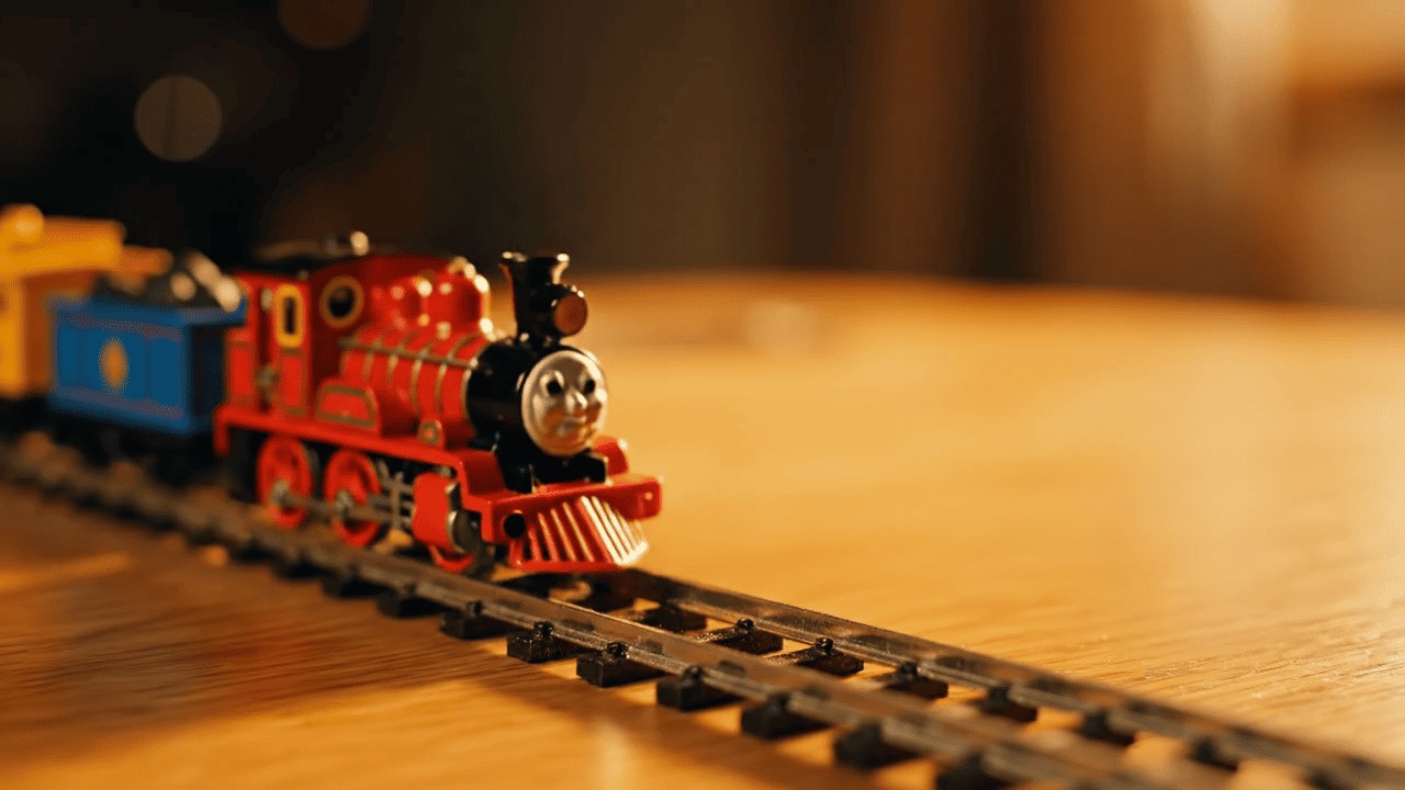 {"description": "Colorful toy train chugs along miniature rails on wooden surface. Camera follows in close-up, wheels turning, pistons pumping. Soft white smoke puffs from smokestack, swirling slowly upward, merging into curves forming Fisher-Price logo suspended in air.", "style": "cinematic miniature, playful nostalgic, soft focus warm tones", "camera": "tracking close-up then slow upward tilt", "lighting": "soft golden with shallow depth of field", "motion": "train moves slowly, smoke rises and morphs into logo", "audio": {"music": "soft nostalgic instrumental", "sfx": "toy train chugging, steam hiss"}}